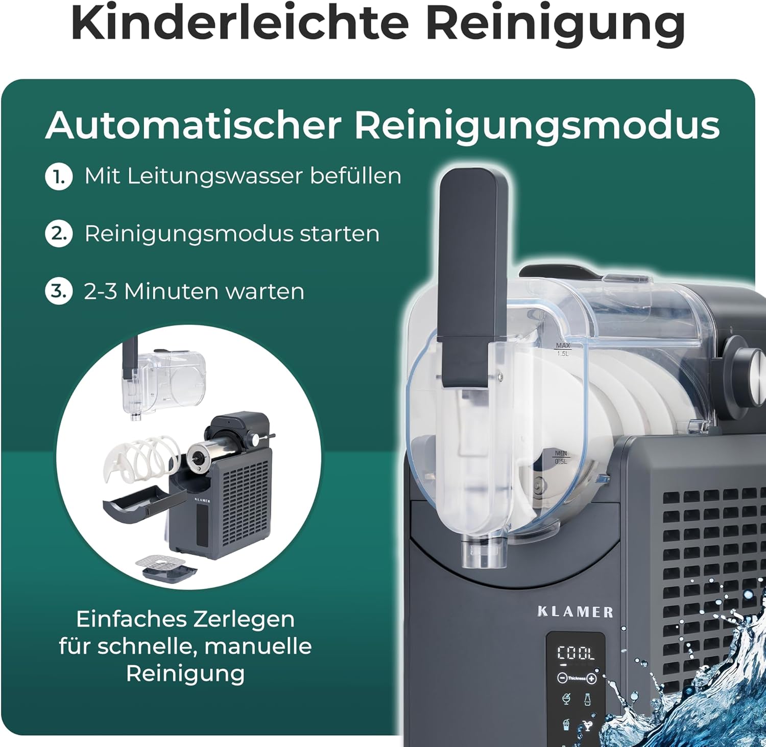 Im Lieferumfang enthalten sind neben der Maschine selbst auch das benötigte Zubehör sowie eine Bedienungsanleitung. Darin findet ihr einen QR-Code, der zu verschiedenen Rezeptideen von KLAMER führt. Ein weiterer QR-Code direkt am Gerät bietet euch ein hilfreiches Video zur ersten Inbetriebnahme. Wir empfehlen, den transparenten Tank vor der ersten Nutzung gründlich zu reinigen. Dafür einfach lauwarmes Wasser mit etwas Spülmittel einfüllen und über das Touch-Display das Reinigungsprogramm starten.