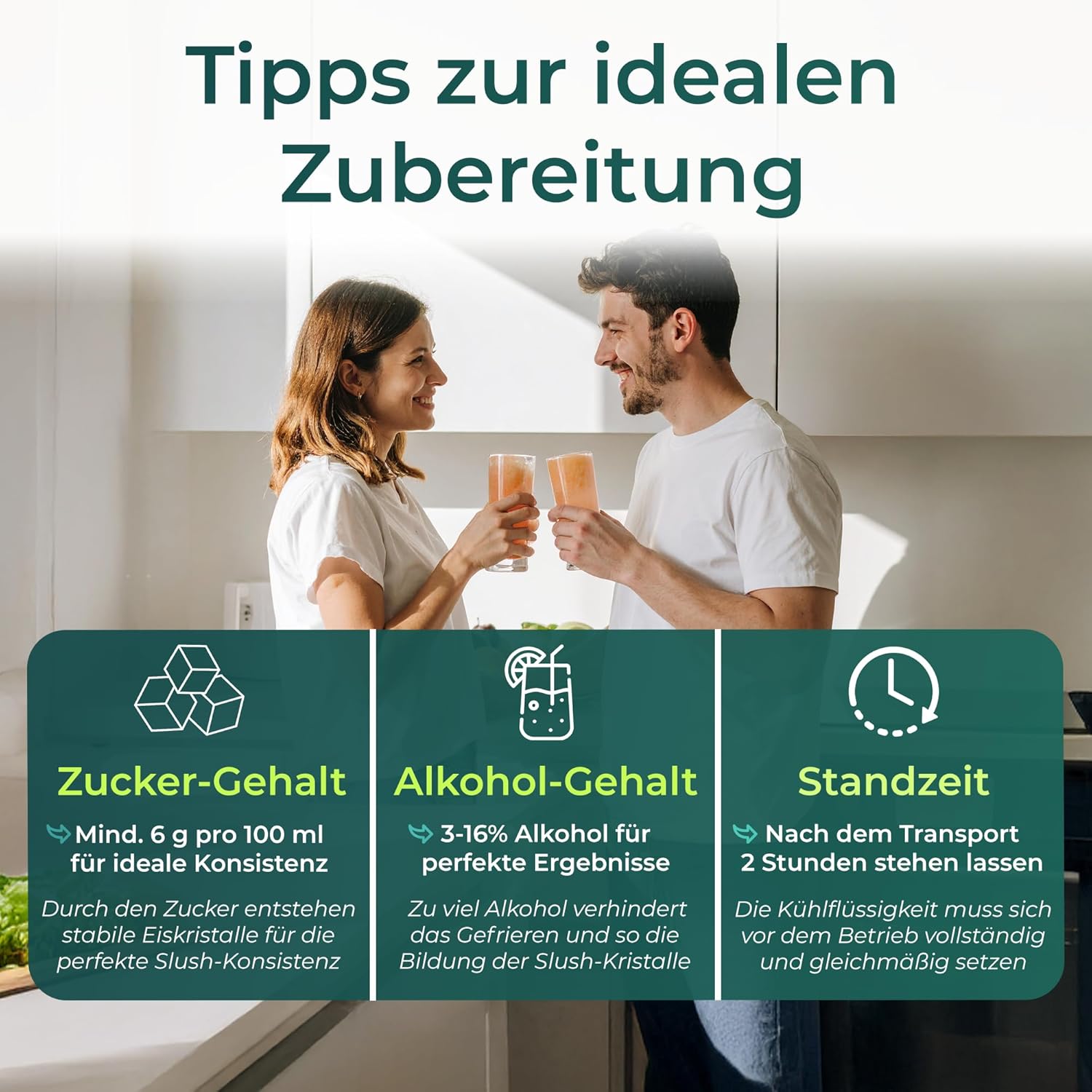 Besonders praktisch: Der integrierte Reinigungsmodus macht die Säuberung nach dem Gebrauch besonders einfach und schnell. Achte bei der Zubereitung lediglich auf den empfohlenen Zuckergehalt von mindestens 6 % – so entsteht die perfekte Slush-Textur. Für alkoholische Slushies sollte der Alkoholgehalt zwischen 3 und 16 % liegen.